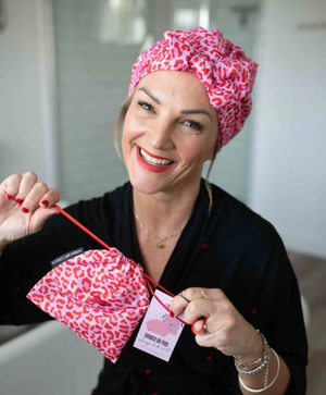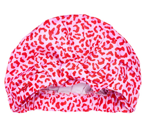 This cute shower cap features a charming bow to the front of the cap on a pretty red leopard print fabric. Say goodbye to frustrating frizzy hair in the shower or at the pool!